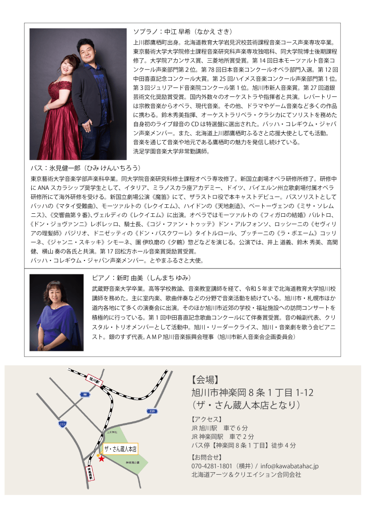 第2弾は鷹栖町出身のソプラノ・中江早希、実力派バス・氷見健一郎、伴奏に旭川を代表するピアニスト・新町由美の3名をお迎えして夜の公演となります。前半は聴き馴染みの日本歌曲・後半は有名なオペラのアリアを中心にお送りいたします。